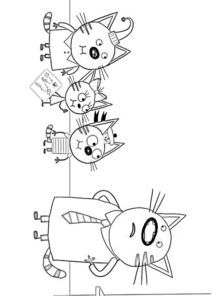 Розмальовки Три кота порадують всіх дітей без винятку. У що живуть в котячому містечку разом з мамою і татом кошенят є четвірка веселих і вірних друзів. Разом герої потрапляють в різні ситуації і не втомлюються шукати нові пригоди, творити добрі справи, допомагати близьким. За допомогою олівців, фломастерів і фарб хлопчики та дівчатка зможуть надати улюбленим героям нові образи, вигадувати цікаві пригоди котиків із забавними іменами Карамелька, Компот і Коржик. Для дітей розфарбовування персонажів улюбленого мультика — цікаве і корисне заняття. Батьки можуть скачати або роздрукувати розмальовки з мультика Три кота в форматі А4 абсолютно безкоштовно.